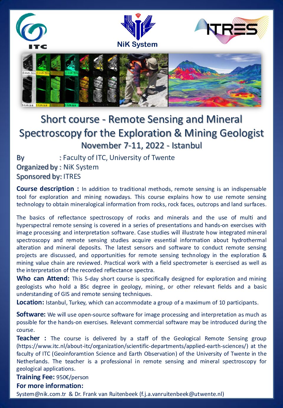 October 25, 2022 Short Course – November 7 – 11, 2022 – Istanbul News By JoAnne Short course – Remote Sensing and Mineral Spectroscopy for the Exploration & Mining Geologist November 7 – 11, 2022 – Istanbul Share